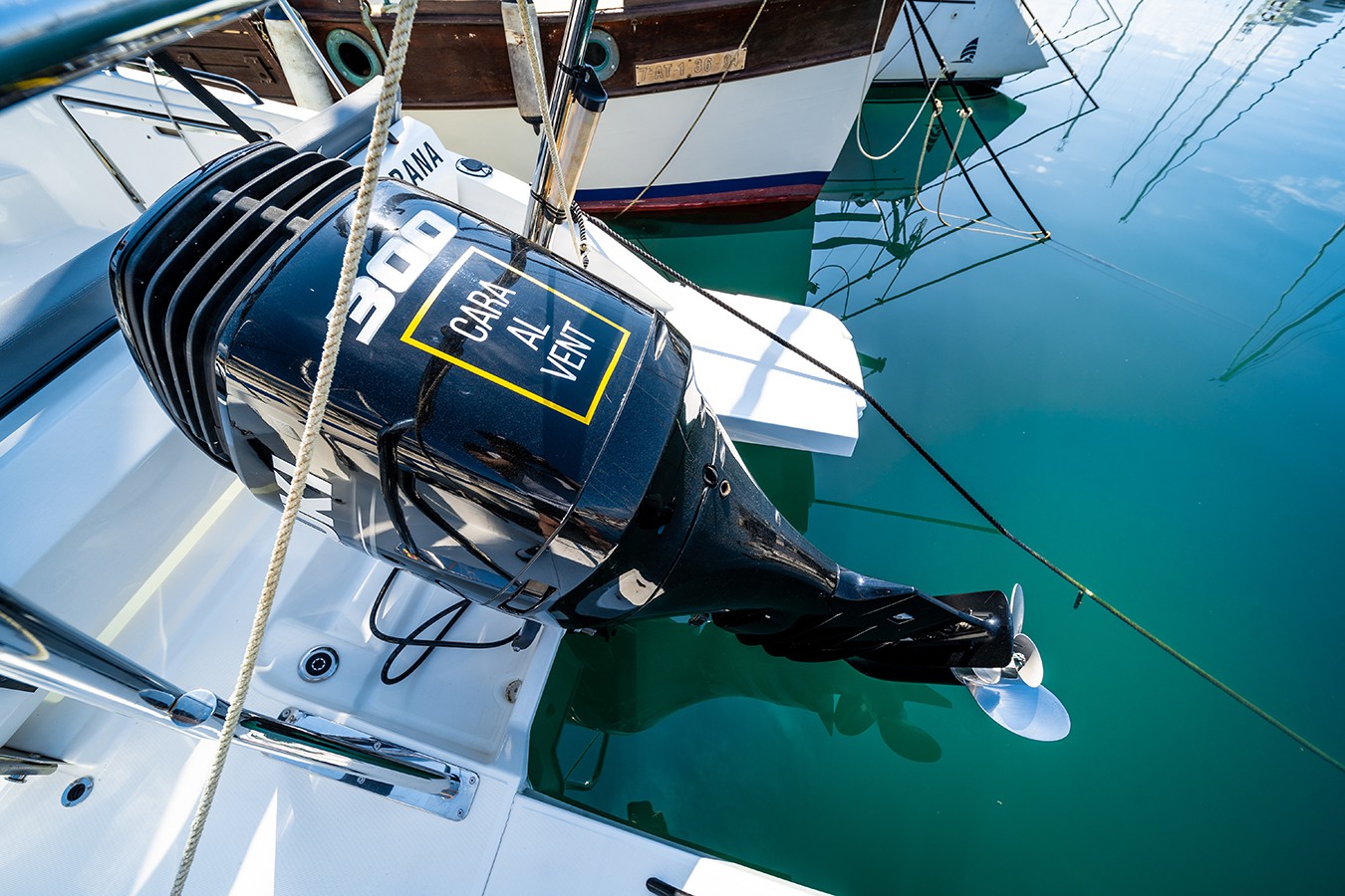 Bimini, Cockpit table, Electric windlass, Outside shower, Teak cockpit, Teak deck, Cockpit cushions, Bilge pump, Swim ladder, Foredeck sun cushions, Electric bilge pump, Loudspeaker (outside), Shower on deck.